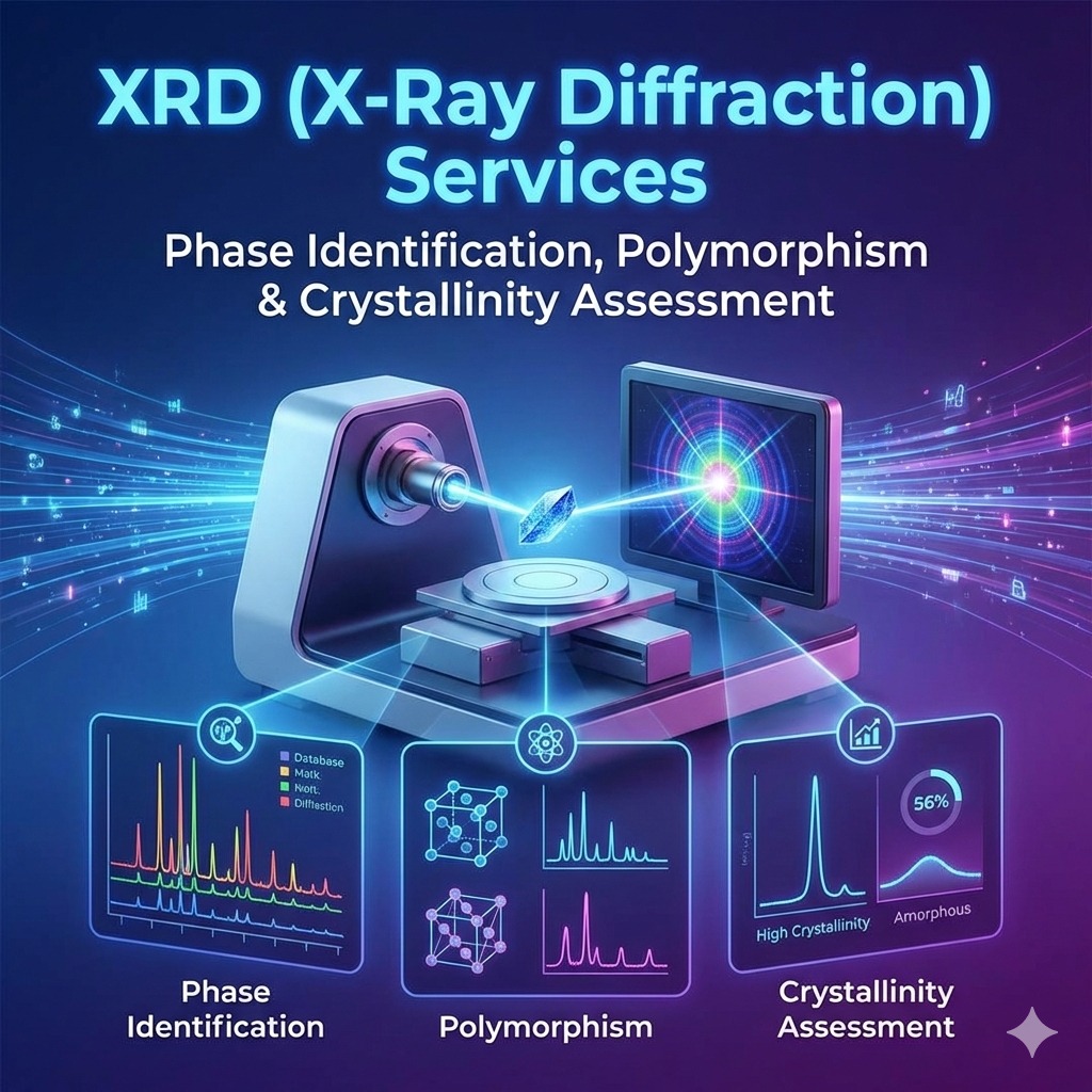 At Dextrose Technologies Pvt. Ltd., we provide XRD (X-Ray Diffraction) for reliable crystalline phase identification and solid-state characterization. XRD is the gold-standard technique to identify crystalline materials, differentiate polymorphs, and assess crystallinity trends—supporting materials science, pharmaceuticals, chemicals, and R&D/QC investigations. Crystalline phase identification We match diffraction patterns to identify crystalline phases and support material verification, contamination checks, and batch comparison. Polymorphism and solid-state characterization We evaluate polymorphic differences and solid-state changes that can impact stability and performance, supporting formulation development and material selection. Crystallinity assessment We assess overall crystallinity trends (semi-quantitative/quantitative as per scope and data quality), useful for comparing processing conditions, heat treatment, or formulation effects. Deliverables * XRD diffractograms with peak list (2θ/intensity) * Phase identification summary (where applicable) * Crystallinity/trend assessment (as applicable) * Interpretation notes and recommendations for follow-up confirmation if required Get started Share your sample type (powder/film/solid), expected phases (if any), and objective (phase ID, polymorph, crystallinity). We’ll recommend the right scan parameters and reporting format.