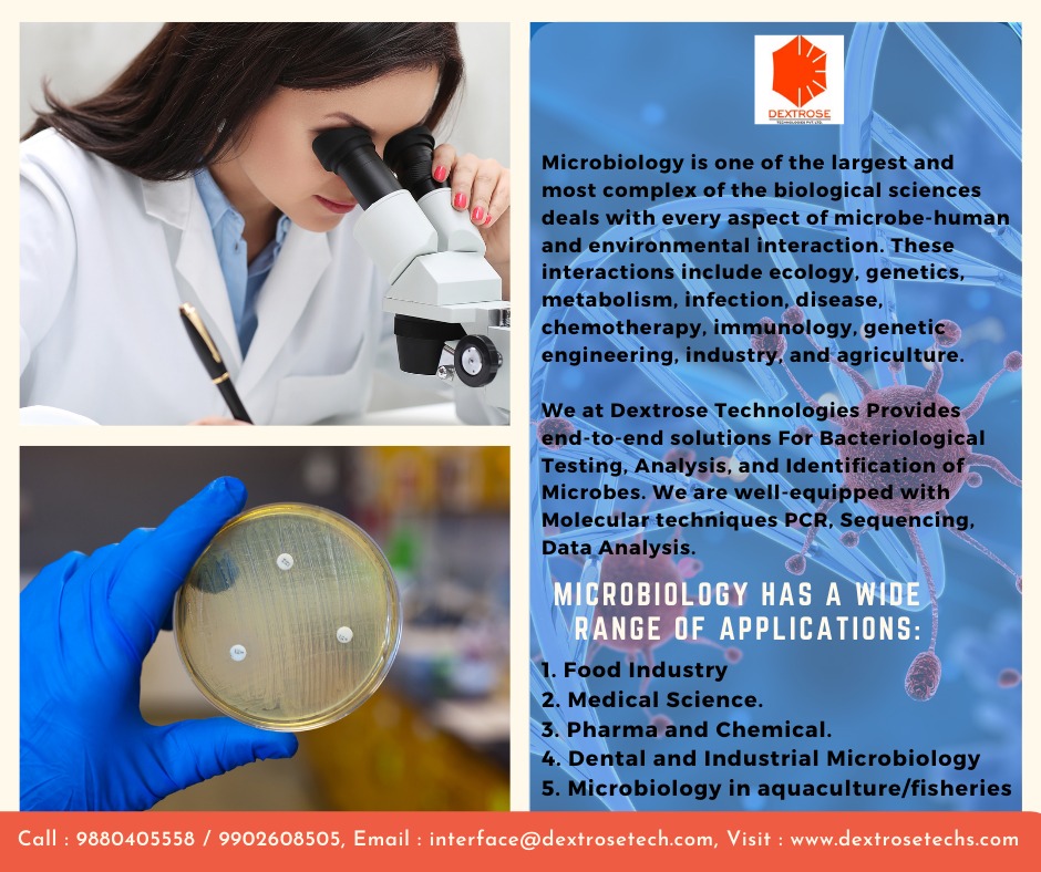Dextrose technologies Bangalore offers a variety of Microbiological services, such as Testing and Analyzing products. Ex : Antimicrobial activity, MIC, MBC etc. We also deal with the dental pathogens both anaerobic and aerobic microorganisms. Ex: E. faecalis, S. Mutans, P. Gingivalis, C. albicans, etc. For More Details : Log onto : http://www.dextrosetechs.com/ Mail : interface@dextrosetech.com Contact : 9686928701