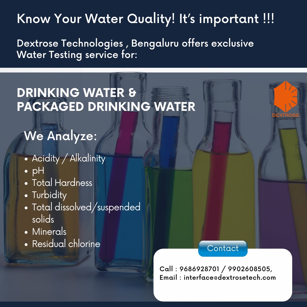 Dextrose technologies provides water testing for house holds, drinking water, portable water, effluent treated water. log onto : http://www.dextrosetechs.com/ Mail : interface@dextrosetech.com Contact : 9686928701