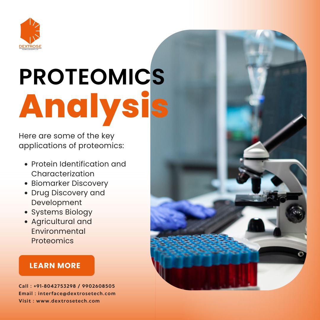 DTPL provides Proteomics analysis which is a branch of molecular biology that focuses on the study of proteins, their structures, functions, and interactions within living organisms. It involves the large-scale analysis of proteins to understand their roles in biological processes and to gain insights into various aspects of life, including human health and disease. The field of proteomics encompasses several techniques and approaches that enable the comprehensive analysis of proteins. These techniques include protein separation, identification, quantification, and characterization. Here are some of the key applications of proteomics: Protein Identification and Characterization: Proteomics allows the identification and characterization of proteins present in a sample. Mass spectrometry is a widely used technique in proteomics, which enables the identification of proteins based on their unique mass and charge properties. By characterizing proteins, researchers can gain insights into their structure, post-translational modifications, and interactions with other molecules. Biomarker Discovery: Proteomics plays a crucial role in biomarker discovery, which involves identifying specific proteins or protein patterns that are associated with certain diseases. By analyzing protein expression profiles in healthy and diseased samples, researchers can identify potential biomarkers that can aid in disease diagnosis, prognosis, and monitoring of therapeutic response. This has significant implications for personalized medicine and the development of targeted therapies. Drug Discovery and Development: Proteomics provides valuable information for drug discovery and development processes. By studying the proteome of a target organism or disease state, researchers can identify novel drug targets and gain insights into the mechanisms of action of existing drugs. Proteomic approaches also enable the analysis of drug-protein interactions, helping in the optimization of drug candidates and the evaluation of drug efficacy and toxicity. Systems Biology: Proteomics plays a crucial role in systems biology, an interdisciplinary field that aims to understand biological systems as a whole. By integrating proteomic data with other omics data, such as genomics and transcriptomics, researchers can gain a comprehensive understanding of cellular processes, signaling pathways, and regulatory networks. This holistic approach helps unravel the complexities of biological systems and provides insights into various physiological and pathological conditions. Agricultural and Environmental Proteomics: Proteomics has applications in agriculture and environmental research. It can be used to study plant and crop proteomes, helping in the identification of proteins involved in plant growth, stress responses, and disease resistance. In environmental proteomics, researchers analyze the proteomes of organisms in response to environmental changes, providing insights into the impact of pollutants and environmental stressors. #Proteomics#MassSpectrometry#ProteinIdentification #Bioinformatics#QuantitativeProteomics #ProteinExpression#MSDataAnalysis #ProteinCharacterization#ProteomeMapping #ProteinomicsResearch#PeptideSequencing #ProteinQuantification#PTMAnalysis (Post-Translational Modifications)#LCMS (Liquid Chromatography Mass Spectrometry)#ProteomicsWorkflow #MSInstrumentation#ProteinBiochemistry #ProteinDataAnalysis#Phosphoproteomics (For analysis of phosphorylated proteins)#ProteomicsSociety (For connecting with the proteomics community) To know more: Log on to www.dextrosetech.com Contact No: 9902608505