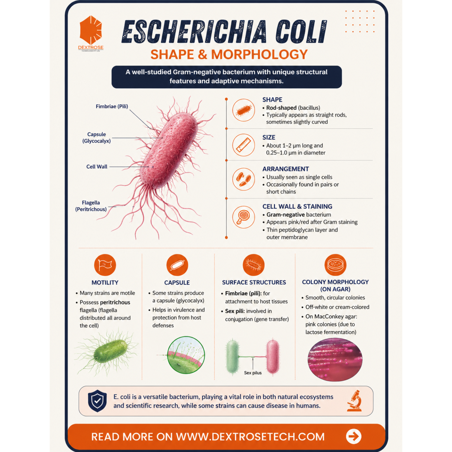 E. coli exhibits a rod-shaped (bacillus) morphology. The cells are typically straight rods, although slight curvature may occasionally be observed depending on growth conditions. This rod-like shape increases the surface-area-to-volume ratio, which enhances nutrient absorption and metabolic efficiency.