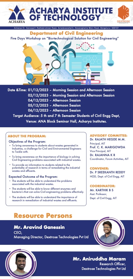 🚀 Join us for a unique exploration into the synergy between Biotechnology and Civil Engineering, led by our industry veterans. This tailored workshop is crafted for 5th and 7th-semester Undergraduate Civil Engineering students.
