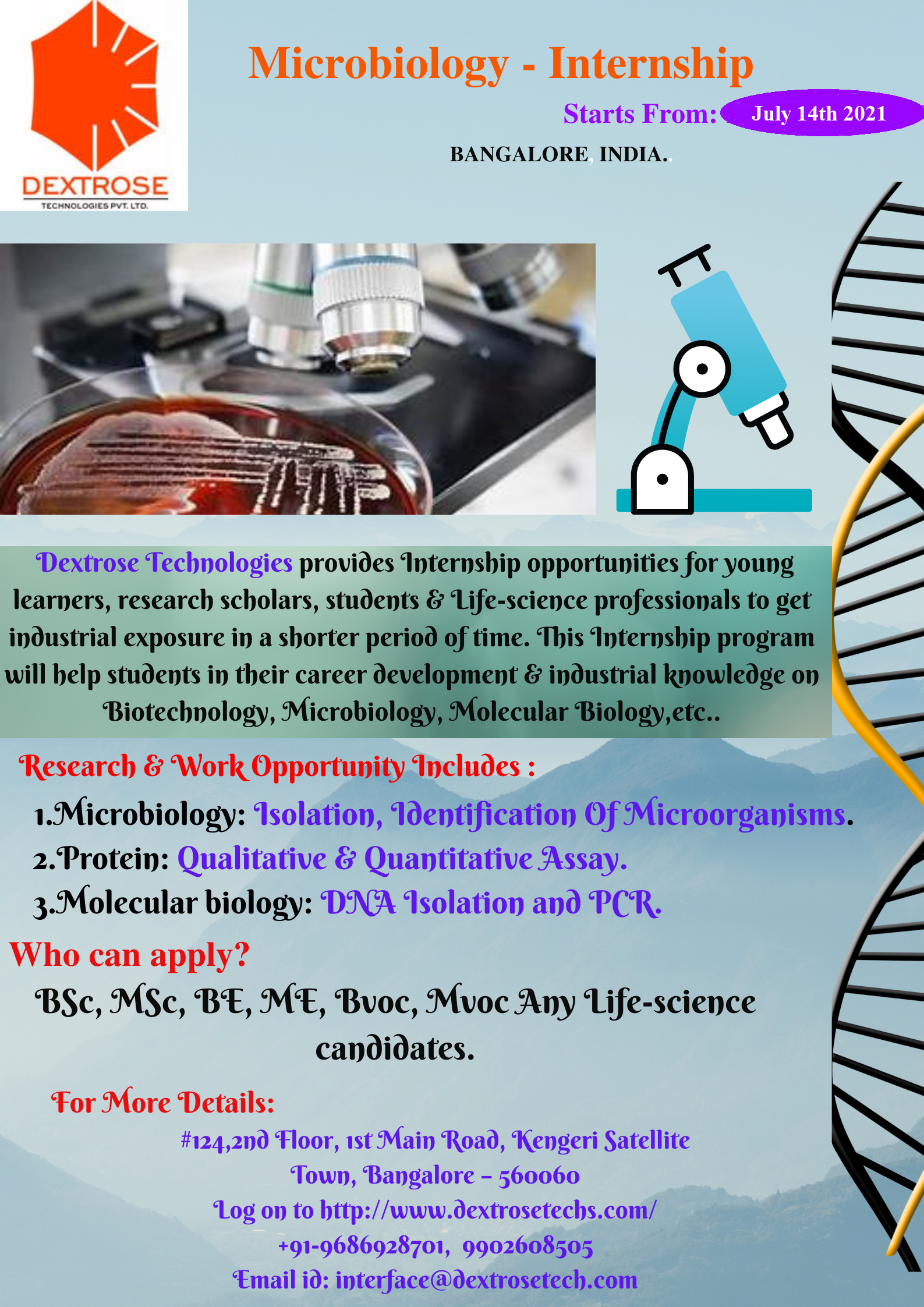 Dextrose Technologies Provides Internship opportunities for young learner, research scholars, students & Life-science professionals to get industrial exposure in a shorter period of time. This Internship program will help students in their career development & industrial knowledge on Biotechnology, Microbiology, Molecular Biology, etc.