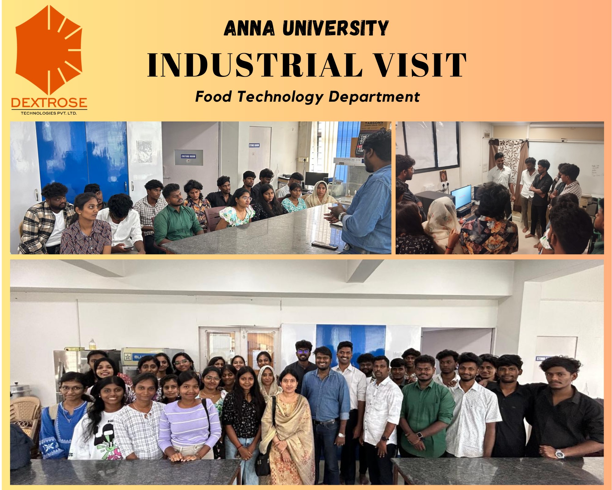 We recently had the pleasure of hosting a group of enthusiastic 4th-year Food Technology students from Anna University at Dextrose Technologies Pvt Ltd. This industry visit provided the students with hands-on experience and valuable insights into the world of food technology and analytical biochemistry.