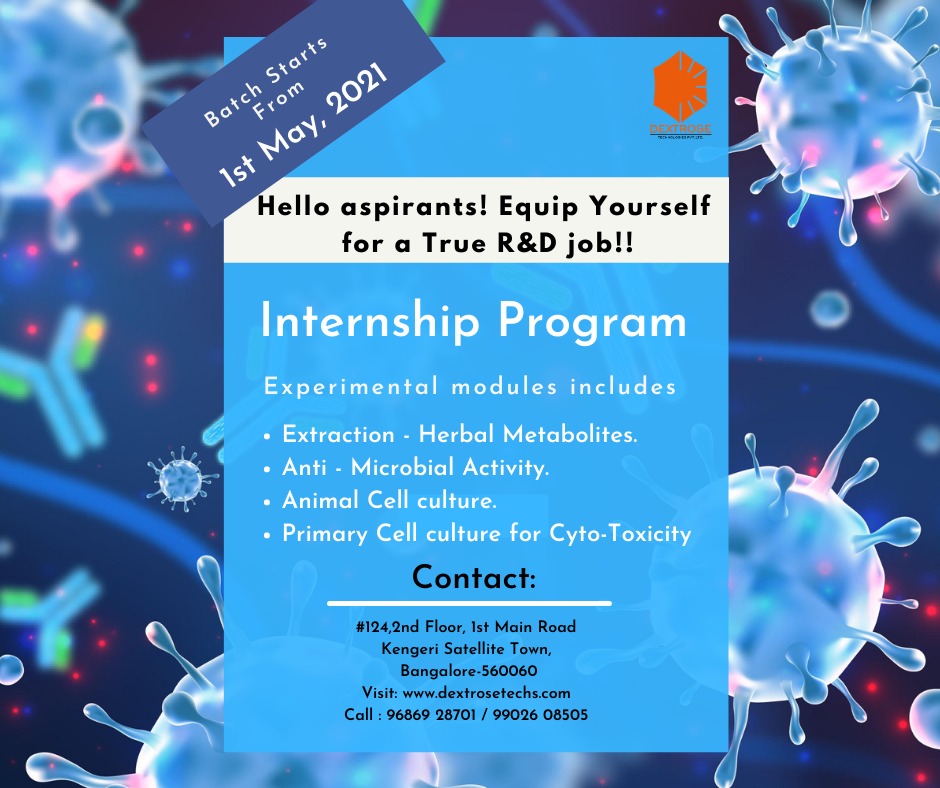 Internship - 2021 Dextrose Technologies Provides Internship opportunities for young learner, research scholars, students & Life-science professionals to get industrial exposure in a shorter period of time. This Internship program will help students in their career development & industrial knowledge on Biotechnology, Microbiology, Molecular Biology etc. Research and work opportunity includes 1. Extraction – Herbal Metabolites. 2. Anti – Microbial Activity. 3. Animal Cell Culture 4. Primary Cell Culture for Cyto – Toxicity To apply : https://forms.gle/aNPkqG5uGJxTkc2E7 Location: Kengeri, Bangalore, INDIA. Tentative Dates: 1St May, 2021 For More Details : Log on to: http://www.dextrosetechs.com/ Aravind Ganessin +91-9686928701