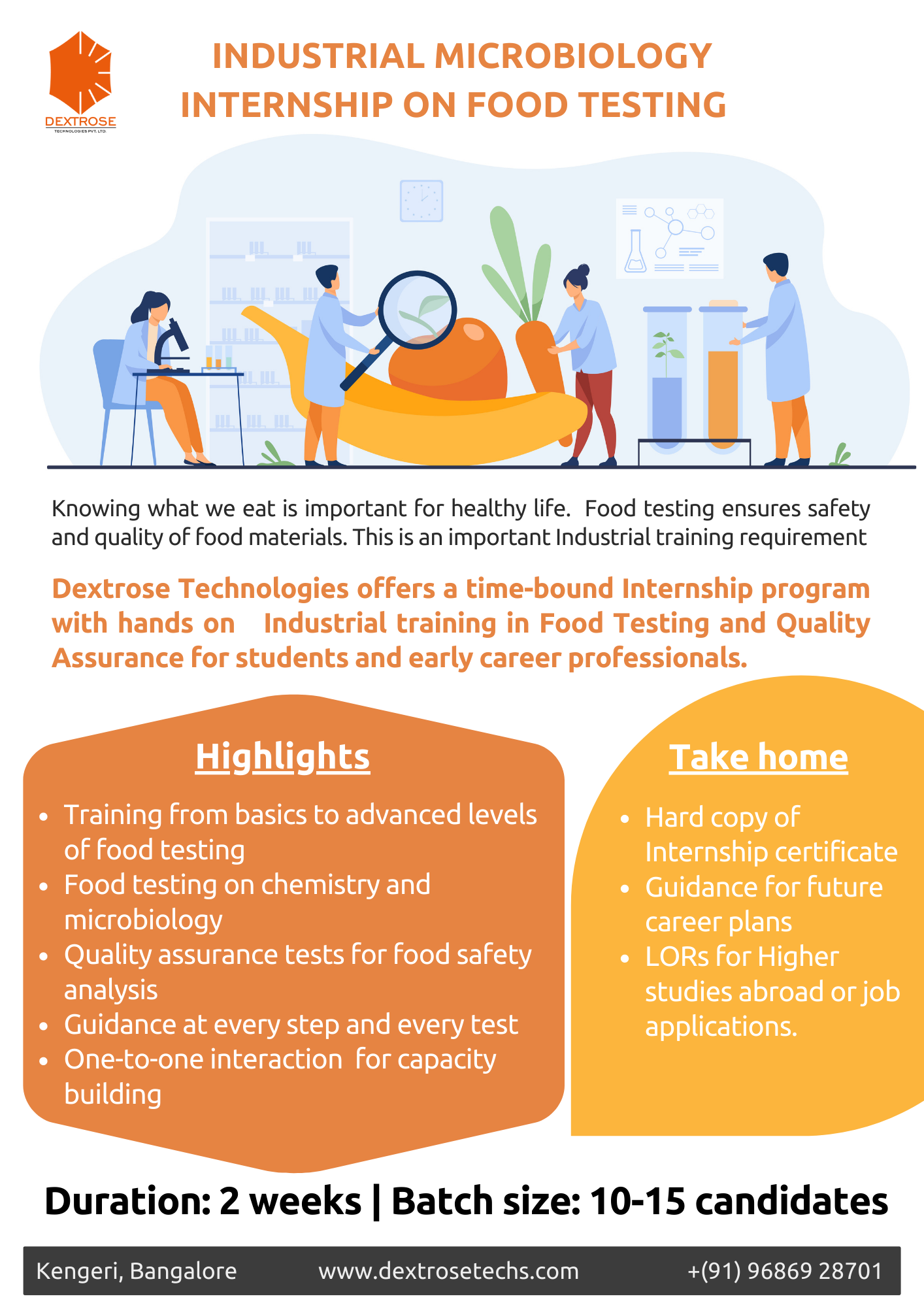 Dextrose Technologies Provides Internship opportunities for young learner, research scholars, students & Life-science professionals to get industrial exposure in a shorter period of time. This Internship program will help students in their career development & industrial knowledge on Biotechnology, Microbiology, Molecular Biology, etc.