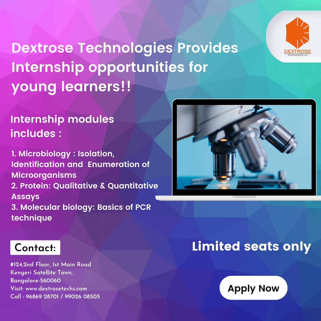 Dextrose Technologies provides Internship opportunities for young learner, research scholars, students & amp; Life-science professionals to get industrial exposure in a shorter period of time. This Internship program will help students in their career development & amp; industrial knowledge on Biotechnology, Microbiology, Molecular Biology, etc.