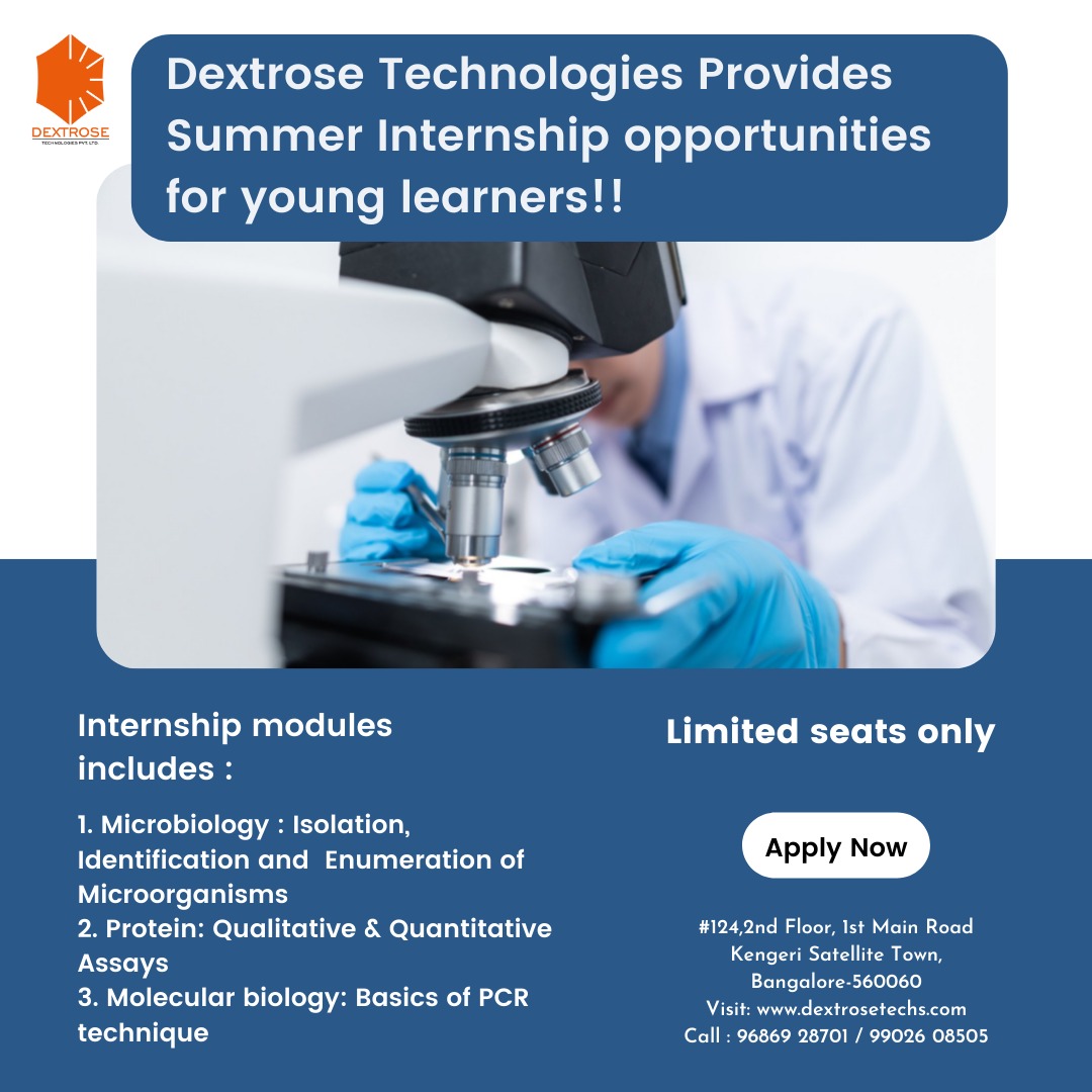 Dextrose Technologies provides Internship opportunities for young learner, research scholars, students and Life-science professionals to get industrial exposure in a shorter period of time. This Internship program will help students in their career development and industrial knowledge on Biotechnology, Microbiology, Molecular Biology, etc.