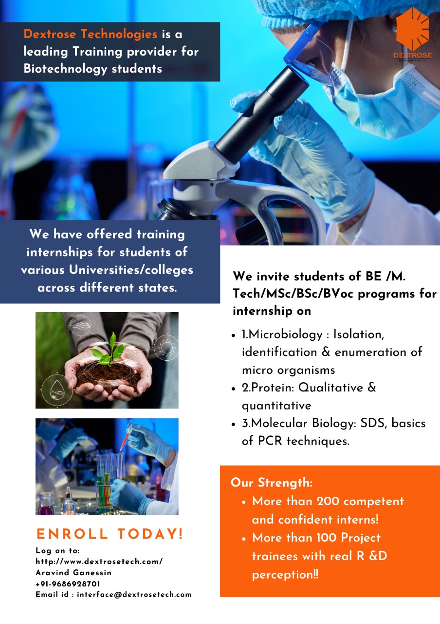 Dextrose Technologies provides Internship opportunities for young learner, research scholars, students and Life-science professionals to get industrial exposure in a shorter period of time. This Internship program will help students in their career development and industrial knowledge on Biotechnology, Microbiology, Molecular Biology, etc.