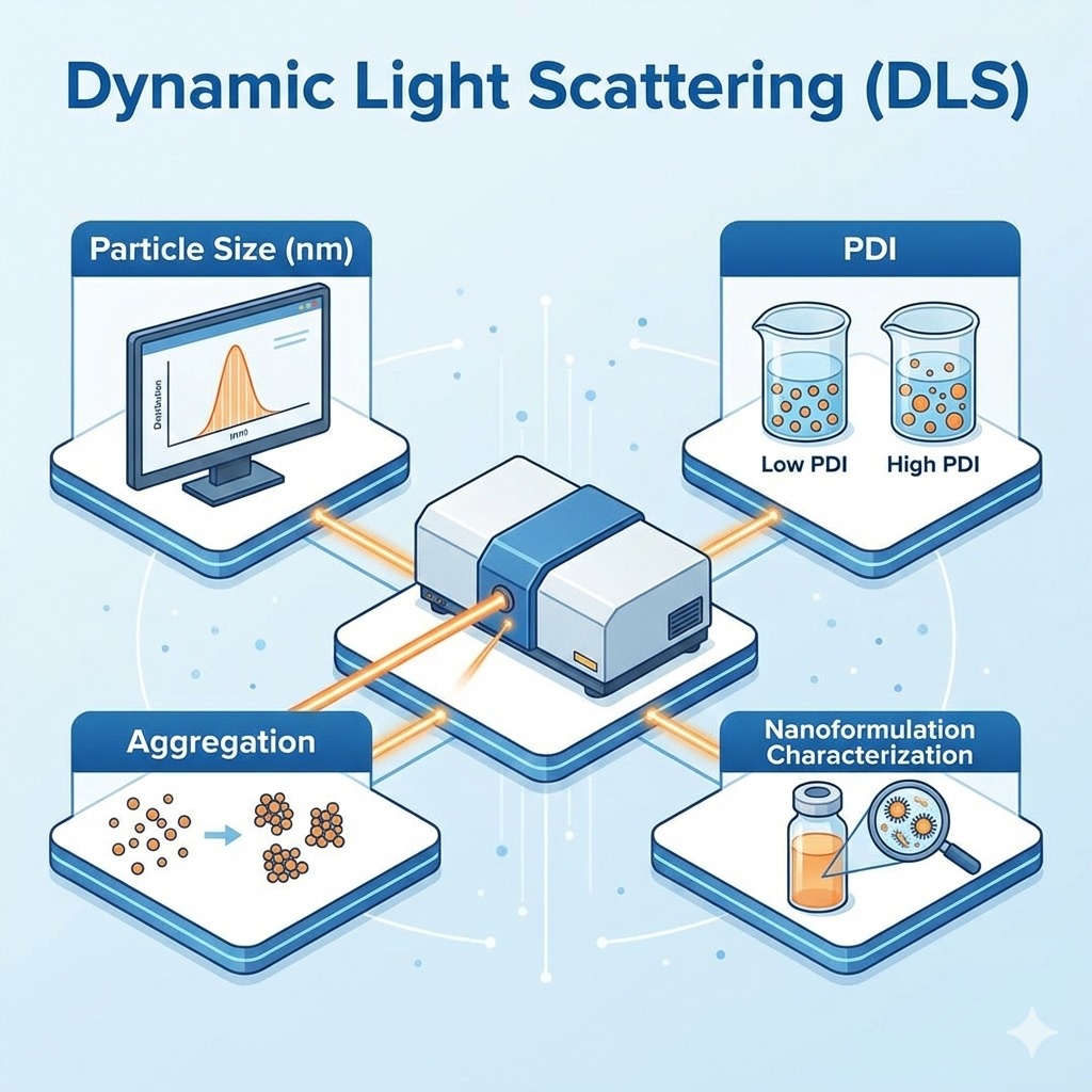At Dextrose Technologies Pvt. Ltd., we provide Dynamic Light Scattering (DLS) for rapid characterization of nanometer-range particle size distribution, polydispersity index (PDI), and dispersion stability. DLS is ideal for routine screening and development work in nanomaterials, nanoformulations, colloids, emulsions, and polymer/biomolecule dispersions, helping you confirm size consistency and detect aggregation early. Particle Size Distribution (Nanometer Range) We measure hydrodynamic particle size in the nm range and provide distribution outputs aligned to your sample type and objective. Polydispersity Index (PDI) Determination We report PDI to indicate dispersion uniformity and batch-to-batch consistency—useful for formulation control and stability screening. Aggregation and Stability Studies We evaluate aggregation trends by comparing size/PDI across conditions or timepoints (e.g., pH, ionic strength, dilution, storage), supporting stability decisions. Nanoformulation Characterization We support nanoformulation development by providing size and PDI benchmarks for optimization and comparative studies. Deliverables * Particle size distribution (Z-average and distribution outputs as applicable) * PDI values with measurement notes * Comparative summary across batches/conditions * Interpretation notes and recommendations for improving stability (scope-dependent) Get started Share your sample type (nanoparticles/emulsion/dispersion), solvent/buffer, expected size range, and concentration. We’ll recommend the right measurement plan and reporting format.