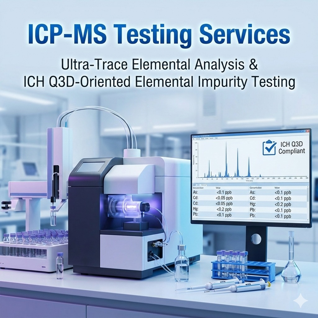At Dextrose Technologies Pvt. Ltd., we provide ICP-MS (Inductively Coupled Plasma – Mass Spectrometry) for ultra-trace elemental analysis and sensitive toxic metal screening. ICP-MS is ideal when you need ppb-level detection, strong selectivity, and multi-element quantification in challenging matrices. We support ICH Q3D-oriented elemental impurity testing for development and QC programs, with scope and limits defined by your product type and regulatory requirement. Ultra-trace elemental analysis We quantify multiple elements at trace and ultra-trace levels with calibration-based reporting and clear units (ppb/ppm or µg/L as required). ICH Q3D-oriented elemental impurity testing We support Q3D-oriented workflows by testing target elemental impurities, documenting method conditions, and reporting results in a structured, review-ready format aligned to your defined specification limits. Toxic metal screening at ppb levels We screen and quantify toxic metals at ppb levels (scope-dependent), helping identify contamination risk in raw materials, intermediates, and finished products. Deliverables * Element-wise concentration table with units and detection notes * Method and sample preparation notes (digestion basis as applicable) * QC checks/calibration summary (as agreed) * Interpretation notes highlighting outliers and trends Get started Share your sample type, matrix details, target element list, and required limits/specification. We’ll recommend the right ICP-MS workflow and reporting format.